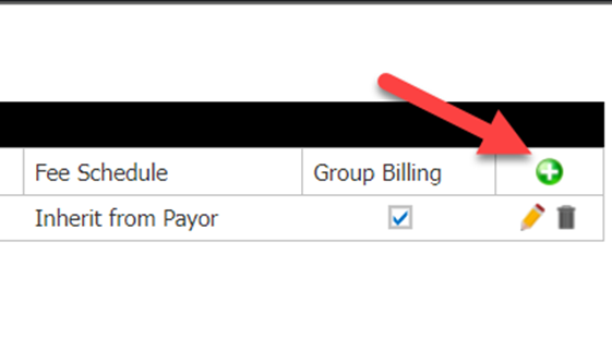 - Once you click the green, the pop-up below will appear. From this pop-up, you will have the ability to add a grouping name, a description(describing the grouping), and a fee schedule if you don’t want to inherit the rates from the payor. You will also be able to choose if you want the grouping to be the group billing grouping, and lastly, you can also add plan codes.