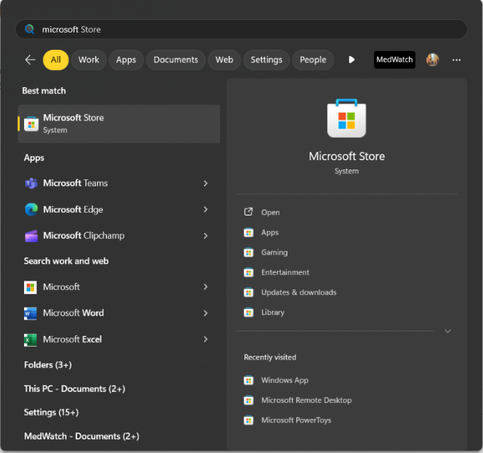 Open the Microsoft store on your local desktop. The fastest way to open it if it's not pinned on your taskbar is to press the Start menu, and search it up.