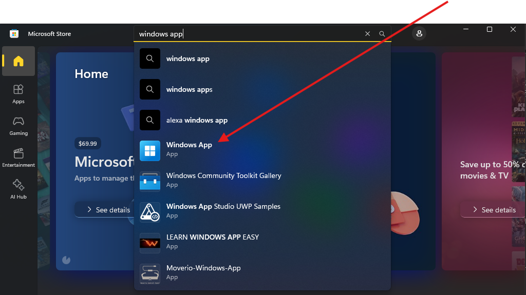Once the Microsoft store is open, you can type "windows app" in the search bar on the top to find the icon for the Windows app. Click on the icon for the Windows app, and it will redirect you to the page to install it.