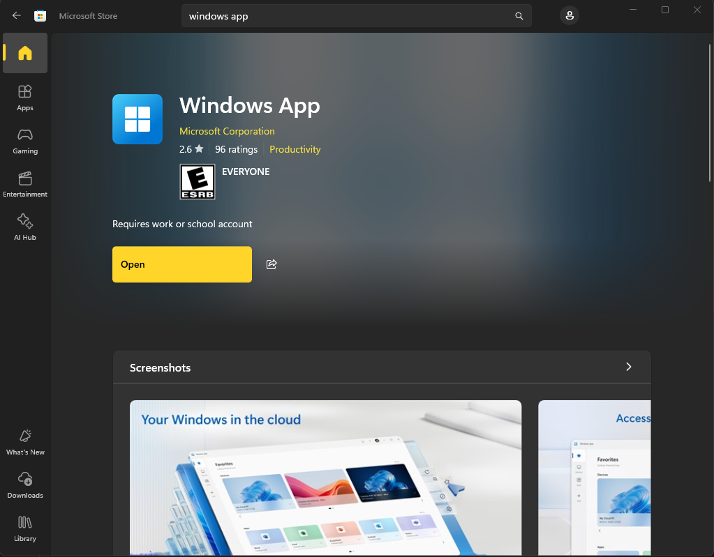 From there, clicking "Open" will bring the Microsoft store to your desktop.